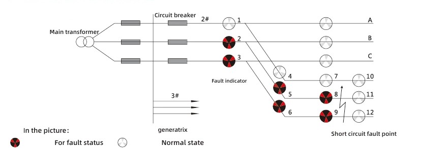 Remiantis trumpojo jungimo gedimų charakteristikomis, veikimo kriterijus yra staigus srovės pokytis kartu su apsauginio įtaiso elektros energijos tiekimo nutraukimu. Gedimų indikacijų diagramos aiškinimo logika yra tokia: jei 2 linijos A fazės 2, 5 ir 8 indikatoriai bei 2 linijos C fazės indikatoriai 3, 6 ir 9 šviečia raudonai, o 11 ir 12 indikatoriai lieka balti, tuomet galima nustatyti, kad tame išeinančios linijos taške įvyko trumpojo jungimo gedimas.