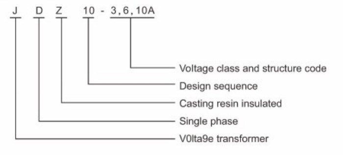 J = įtampos transformatorius, D = vienfazis, Z = epoksidinės dervos liejimo izoliacija, 3/6/10 = įtampos lygis.