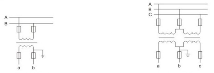 Vienfazės linijos įjungimo schema Trifazės linijos sujungimo schema